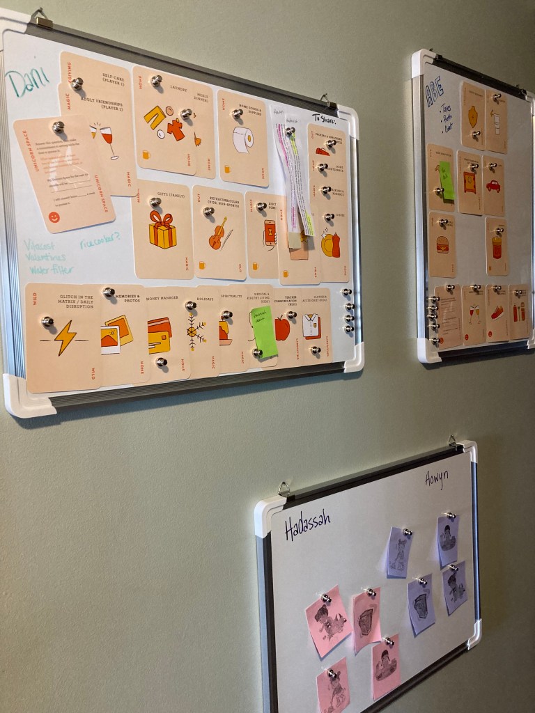 As a practical way to make this ongoing process and weekly re-negotiation more visible, we’ve set up white boards in our kitchen displaying our key cards and the ones we trade back and forth as needed. We made some cards for our kids too, so we call feel included and be able to see our contributions to making our home and family a collaborative place.