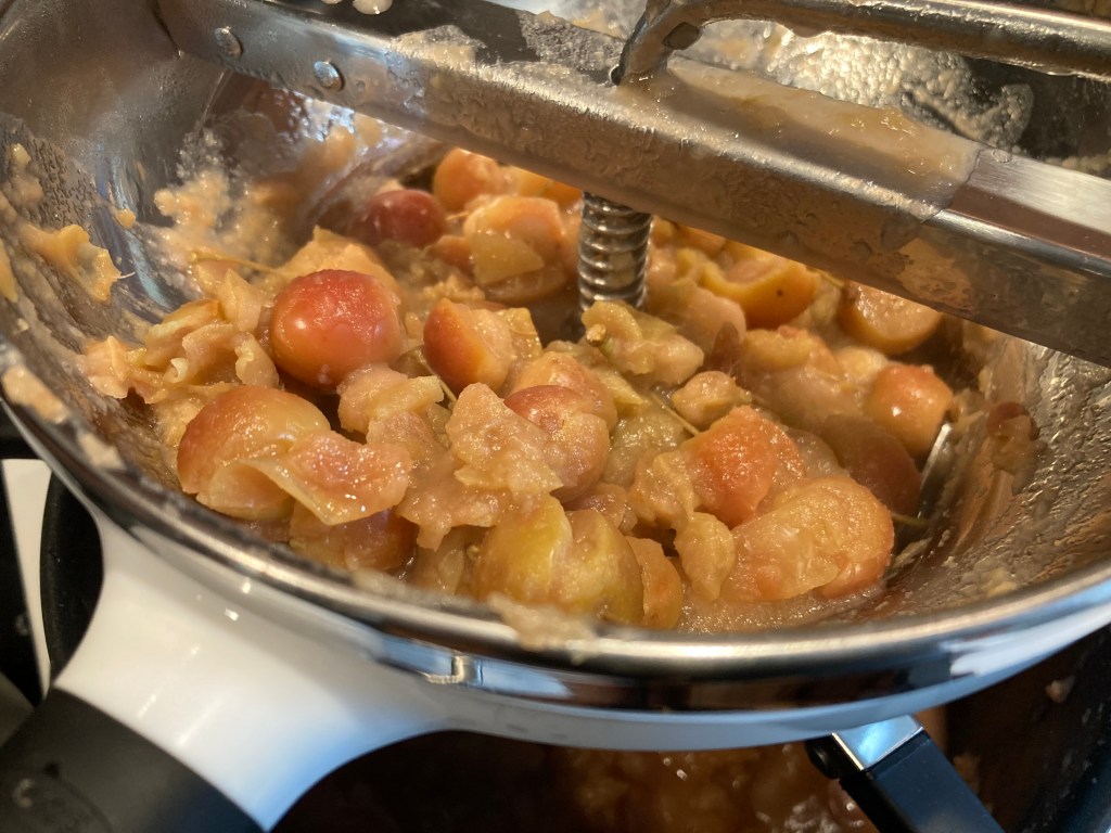 Their skins crack in the hot water, splitting open to reveal the softer fruit inside. One, two, three ladles at a time, I transfer them from the boiling water pot to the food mill. My arm cranks the handle round and round, turning right to press them down, left to scrape the grate clean. Right, right, right. Left, left. Press, press, press. Reset.