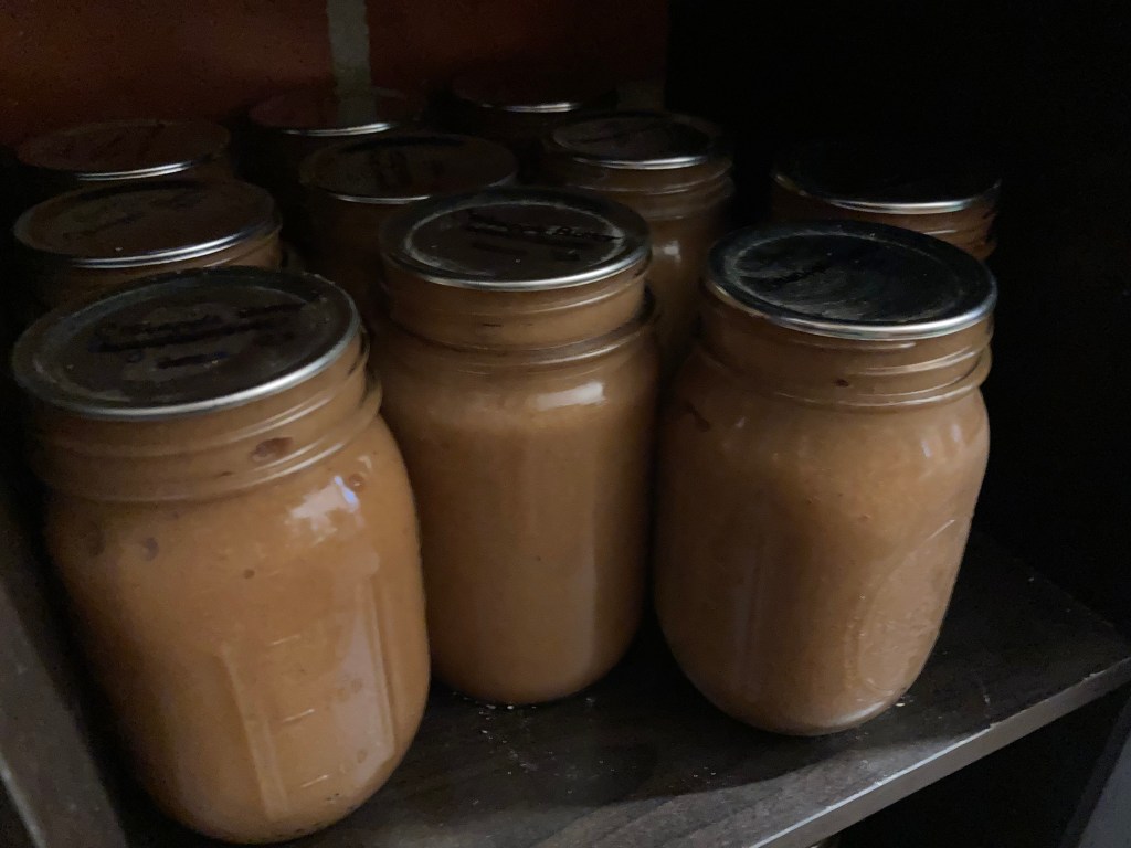 I’m a veteran canner, but I’ve never used a food mill before. The first couple batches I painstakingly use a spatula and spoon to keep pressing what is left in the mill into position to get further pressed. Surely all this isn’t leftover as waste? I’m convinced there has to be more edible flesh to press through to the other side. Yet slowly I realize it is all waste. Or at least mostly waste and whatever remaining fruit on this side of the grate is not worth my time and energy. I surrender to good enough and spoon out the pulp—gathered seeds, skins, and stems—to a bowl to be thrown away later. The process repeats so often my body falls into a rhythm. The pile of creamy peach-colored applesauce grows beneath the food mill.